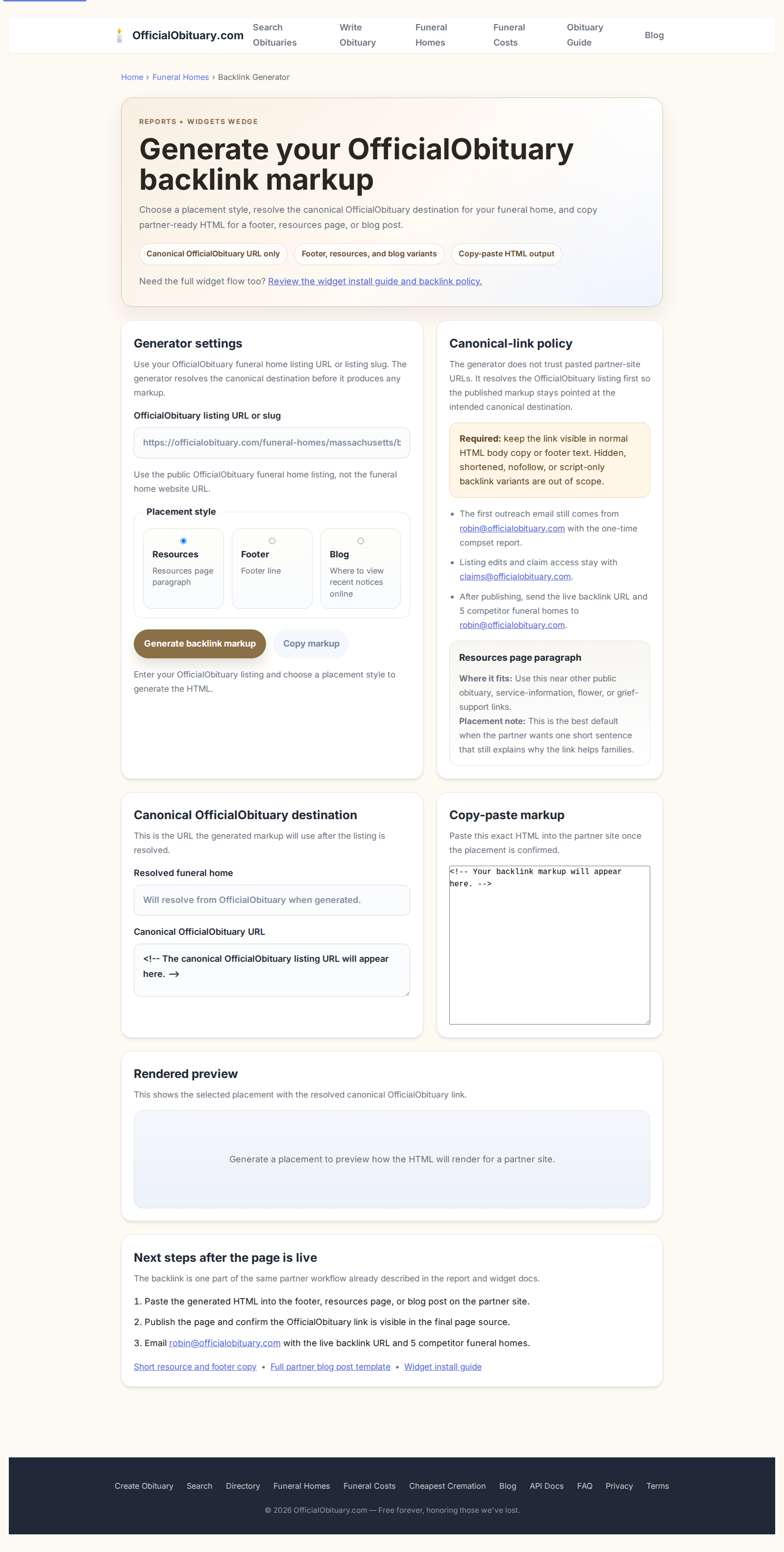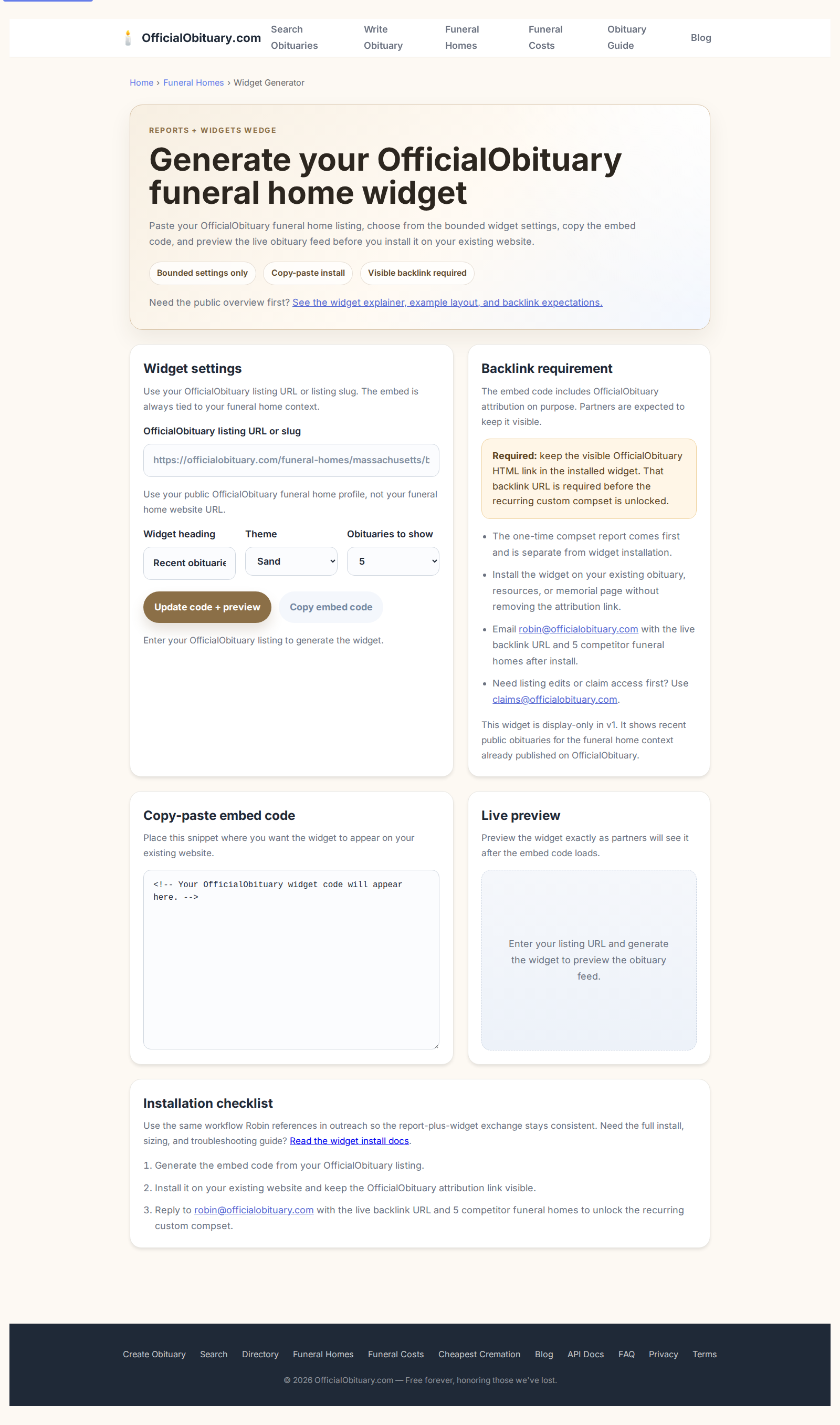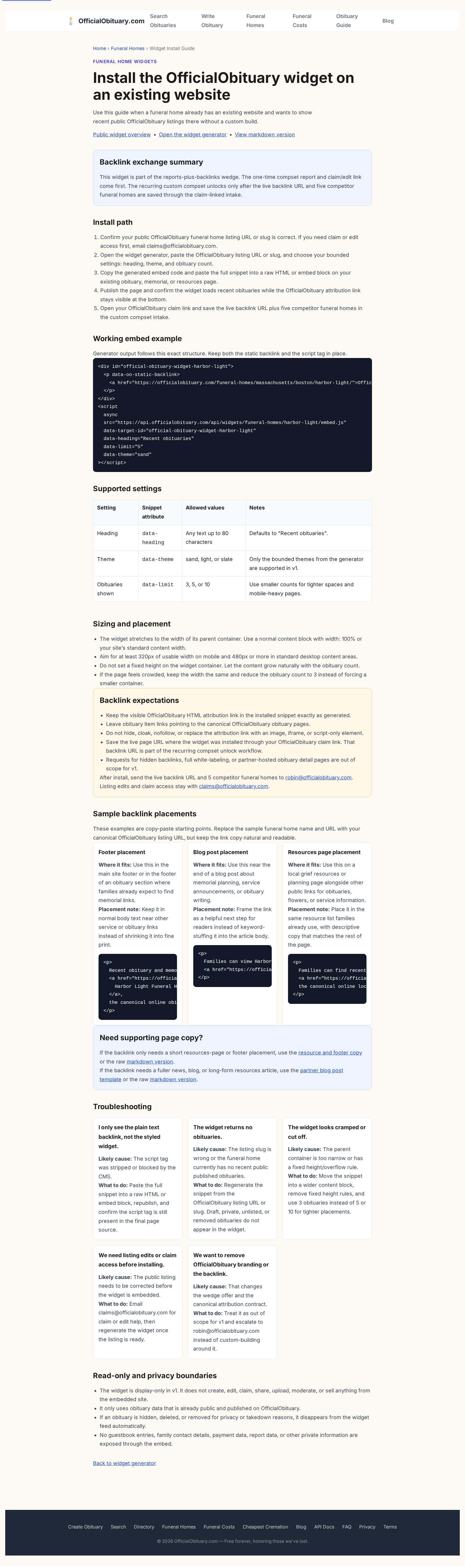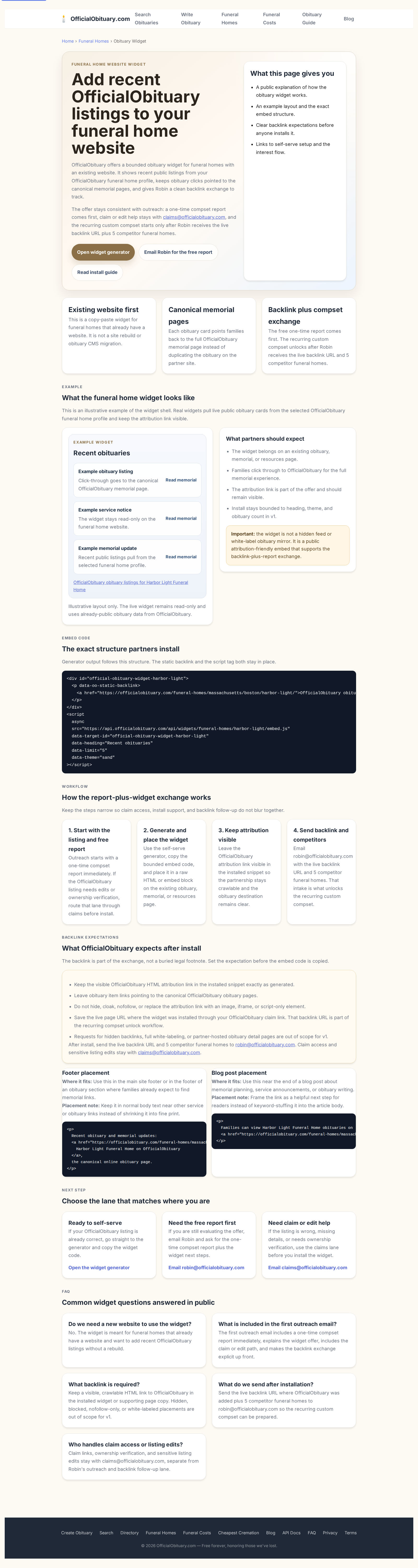 - Save the live page URL where the widget was installed through your OfficialObituary claim link. If that link is missing, use [email protected] only as a fallback. The backlink URL is part of the recurring compset unlock workflow.